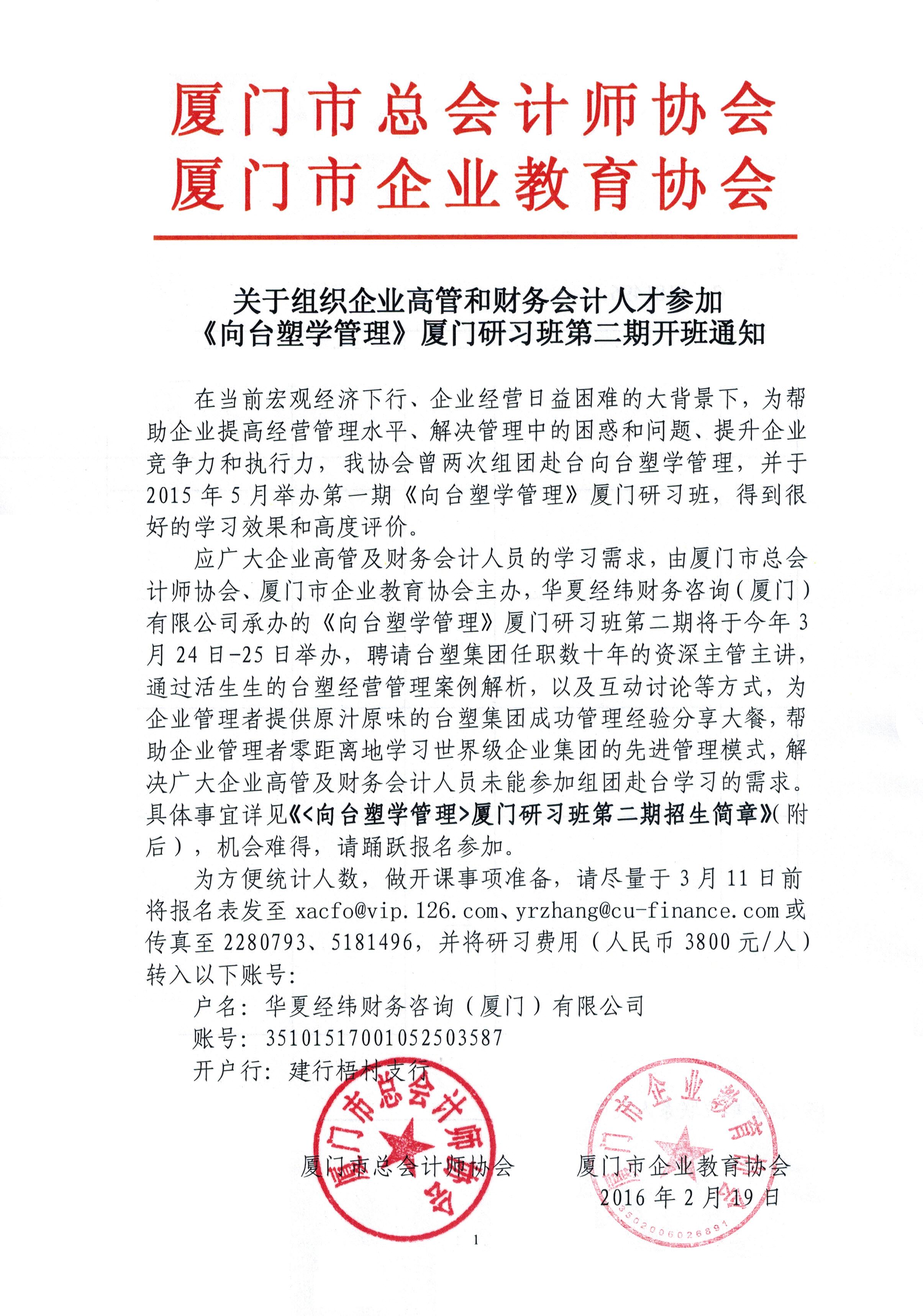 關(guān)于組織企業(yè)高管和財(cái)務(wù)會(huì)計(jì)人才參加《向臺(tái)塑學(xué)管理》廈門研習(xí)班第二期的通知